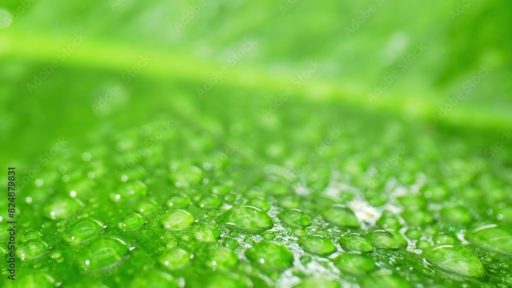 Glistening dewdrops dance on lush, emerald leaves in this mesmerizing macro close-up. Nature's jewels shine. Natural beauty concept. Green background.