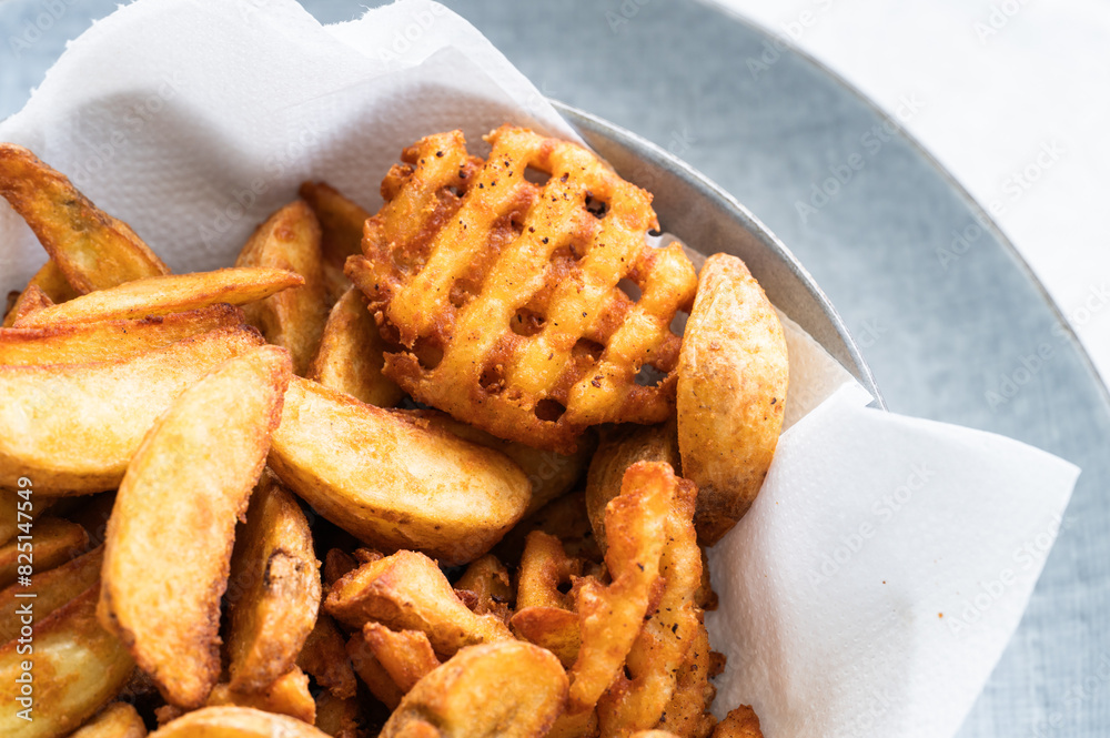 Various types of French fries made in the home fryer full of oil, unhealthy food.