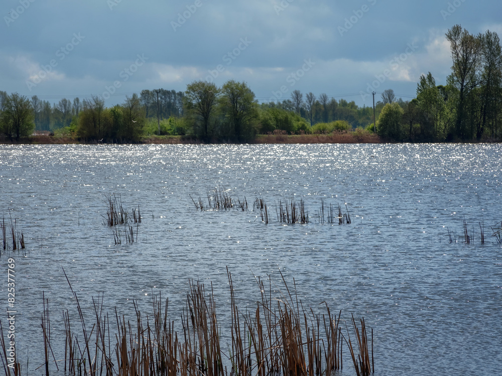 Colorful sunny spring landscape with sparkling water in the lake in the sun.