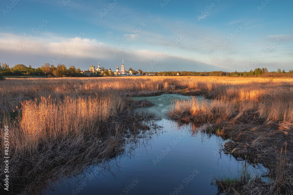 Trinity-Sergius Varnitsky Monastery. Dry reeds in the water in the golden rays of the sun.