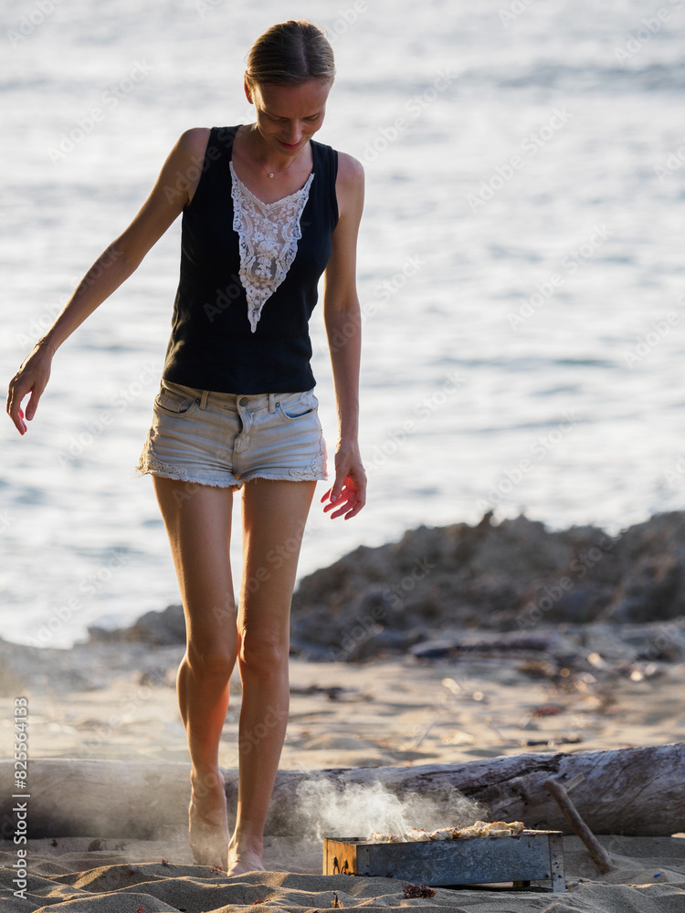 Woman cooking fried chicken on a tropical sandy beach, near the ocean.