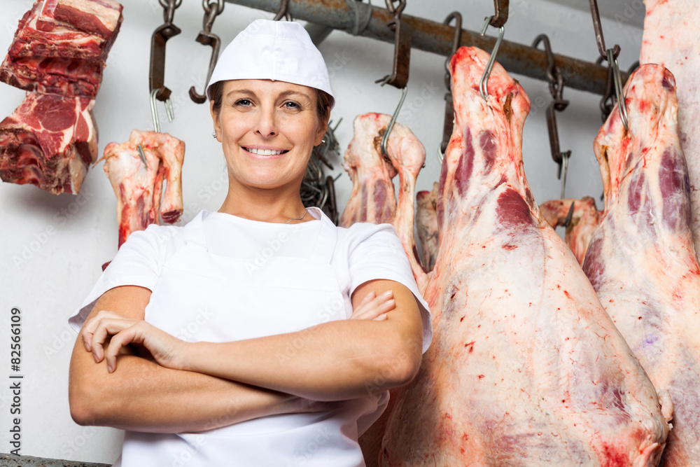 Butcher Standing Against Meat Hanging In Butchery
