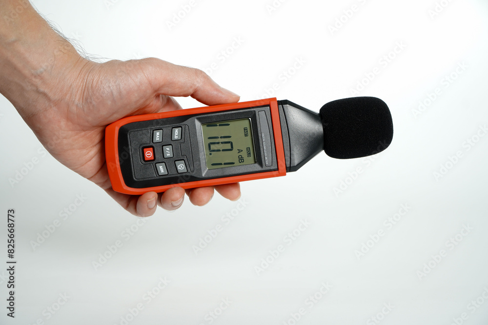 Pollution is too loud.hand holding a digital sound level on a white background,Sound level meters are commonly used in noise pollution studies.
