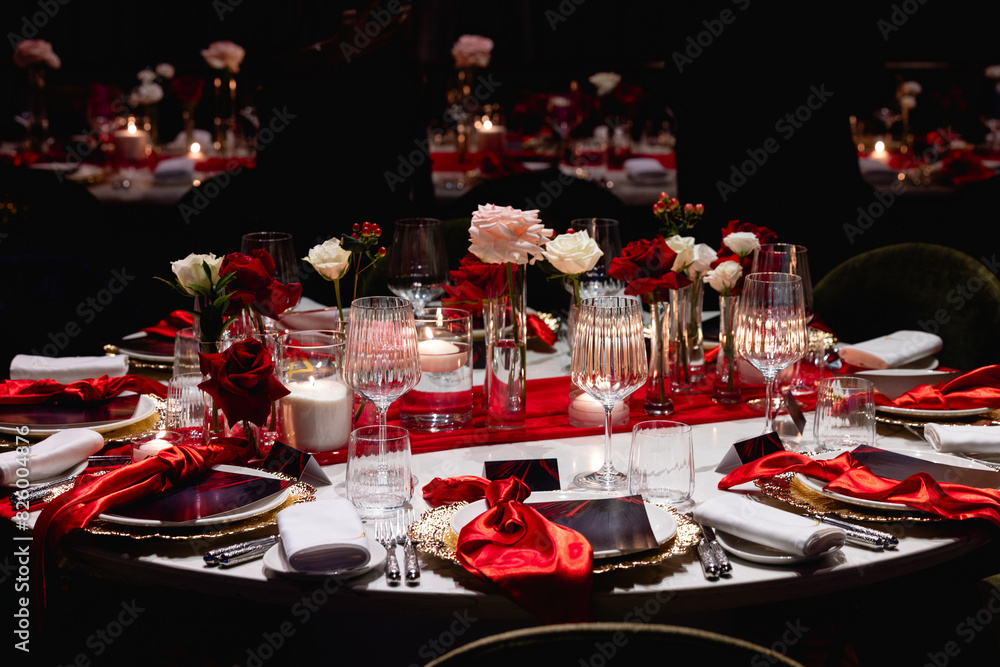A red napkin on a luxurious wedding table for guests creates an elegant ambiance through beautiful table setting. A table setting in red.Christmas and New Year