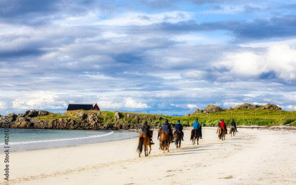 Horse Riding on the Beautiful Beach of Hovsvika on Gimsoya in Lofoten, Norway