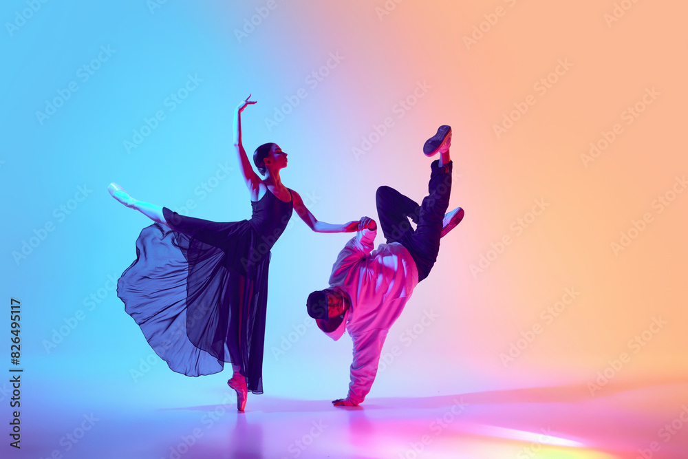 Ballet and street dance mix. Beautiful young girl in black dress, ballerina dancing with young man, hip hop performer on gradient background in neon. Concept of classical and modern dance, performance