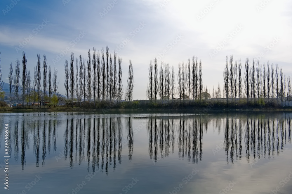Kyrgyzstan. Picturesque reflections of pyramidal poplars in the morning surface of Lake Issyk-Kul.