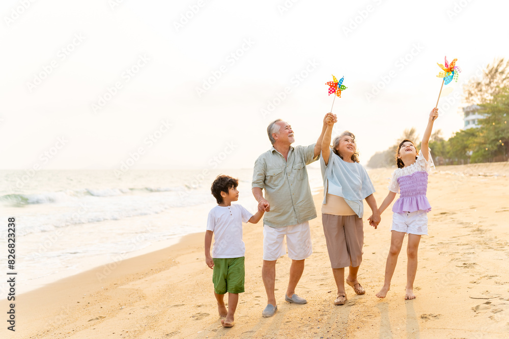Happy Asian family travel ocean on summer holiday vacation. Grandparents and grandchildren boy and girl enjoy and fun outdoor lifestyle walking and playing together at tropical island beach at sunset.