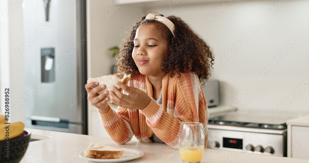 Child, sandwich and eating food in home kitchen or healthy nutrition with orange juice, student or breakfast. Girl, kid and morning hungry or bread snack in apartment for fiber meal, diet or youth
