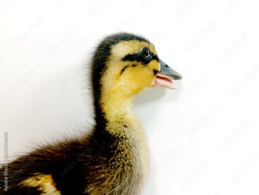 1 week old newborn duck baby isolated on white background. Close-up of little duck with yellow feathers, can be used as background or shading.