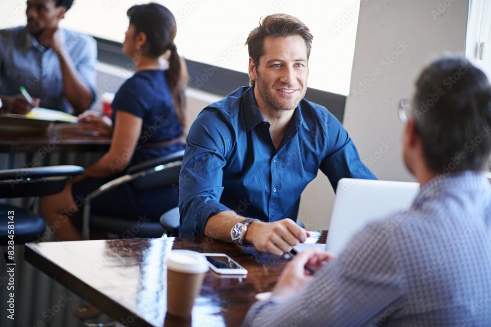 Job center, discussion and business people in office for career consulting, hiring and onboarding. Professional, meeting and men with laptop for online application, recruitment agency and employment