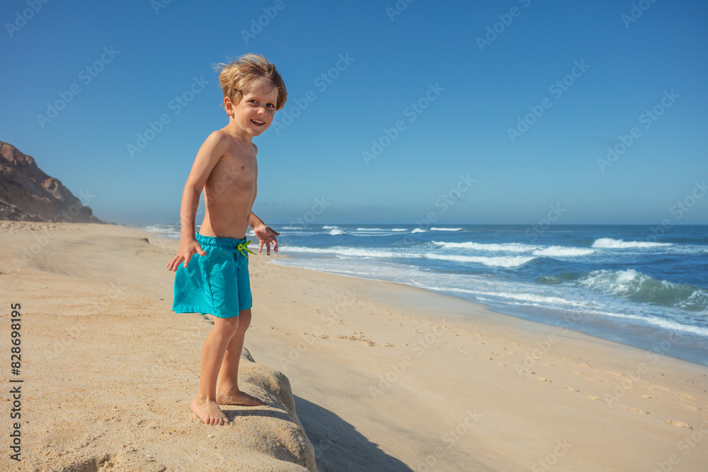 Cute boy on sandy beach smile and gaze at waves under blue sky