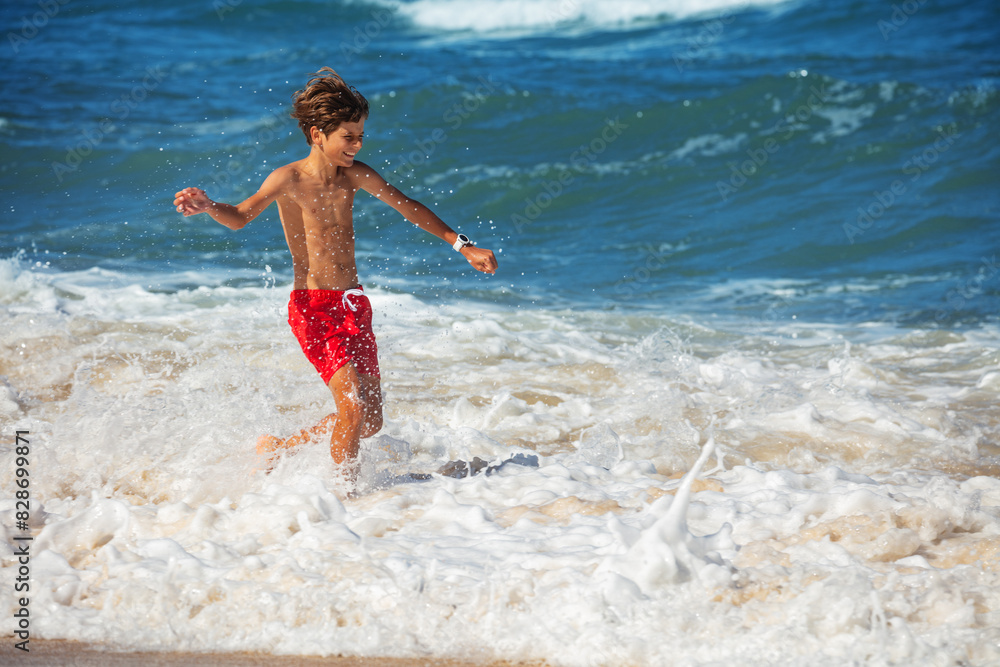 Boy joyfully running on refreshing beach waves, wear red shorts