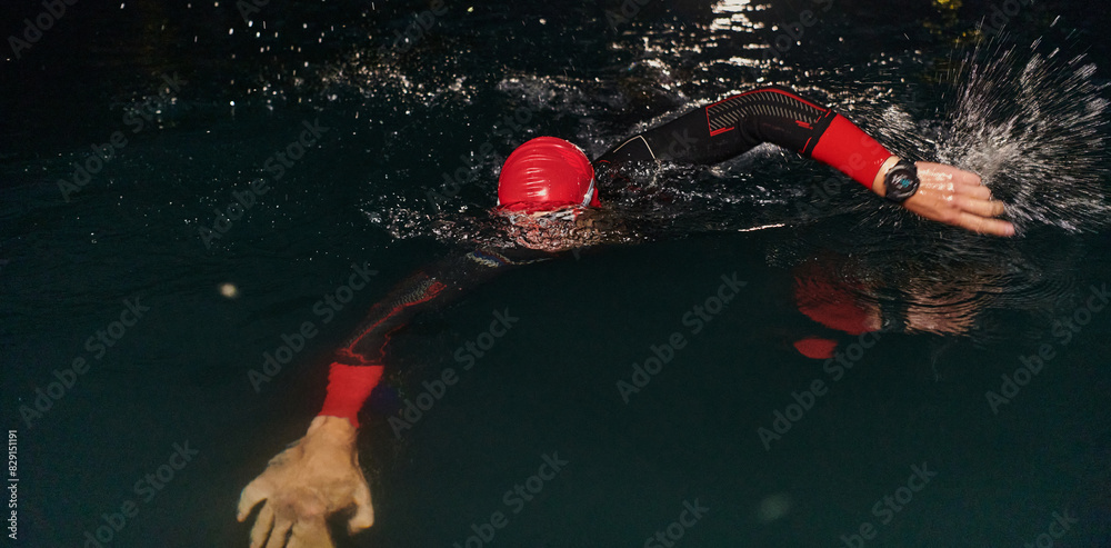 A determined professional triathlete undergoes rigorous night time training in cold waters, showcasing dedication and resilience in preparation for an upcoming triathlon swim competition