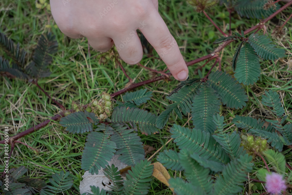 Touching the sensitive leaf of Mimosa pudica (touch-me-not) with a finger.