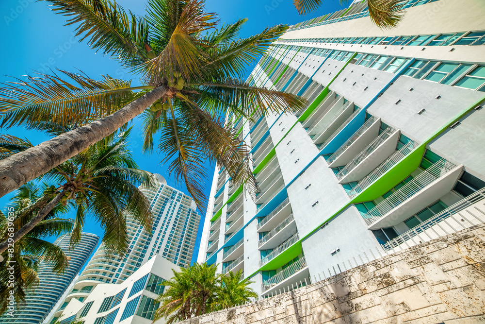 Skyscrapers and palm trees under a blue sky in downtown Miami.
