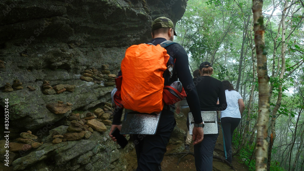 Group of tourists is walking along mountain trail in forest. Clip. Active tourists walk along trail in dense forest with rocks. Tourists go on difficult hiking route in forest with rocks