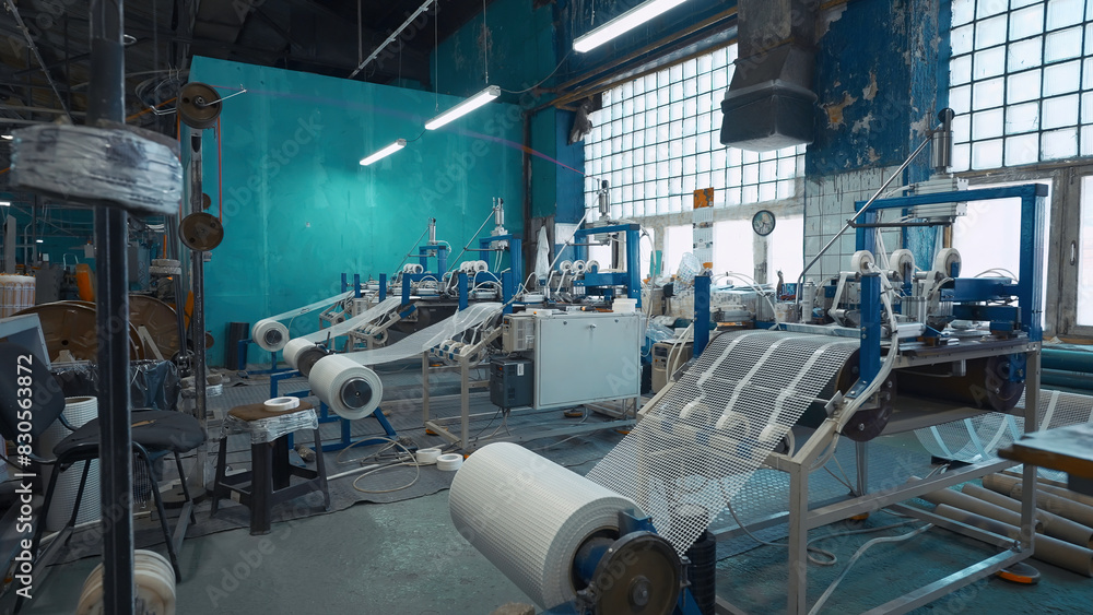 Industrial production of plastic grids. Creative. Machines winding thermoplastic meshes made of polymers. Assembly shop of chemical plant of polymer products
