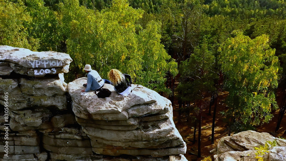 Beautiful nature, summer scenery. Footage. Couple of young extreme hikers having a rest on clifftop.