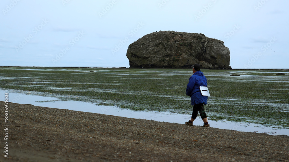 Tourist walks on seashore with algae. Clip. Man walks along seashore after storm on cloudy day. Boy with umbrella walks on coast on cloudy day