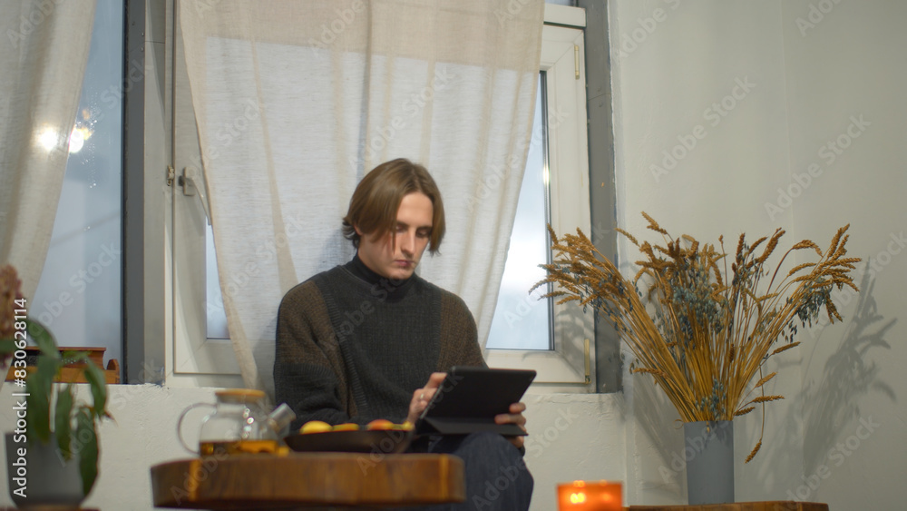 Young man drinks tea and works on tablet in cafe. Media. Student is relaxing with tablet and tea in cozy cafe. Handsome student studying on break in cafe