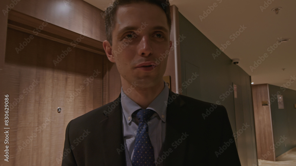 Security man walking along rooms in hotel corridor. Stock clip. Young man in suit in a dark building hall.