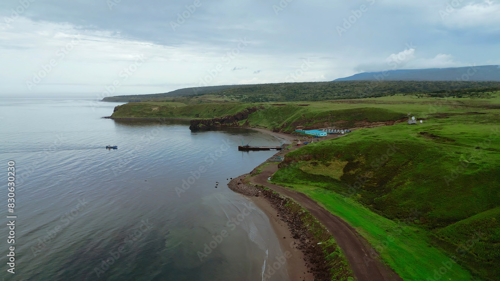 Aerial view of the small river port. Clip. Beautiful valley and big river.