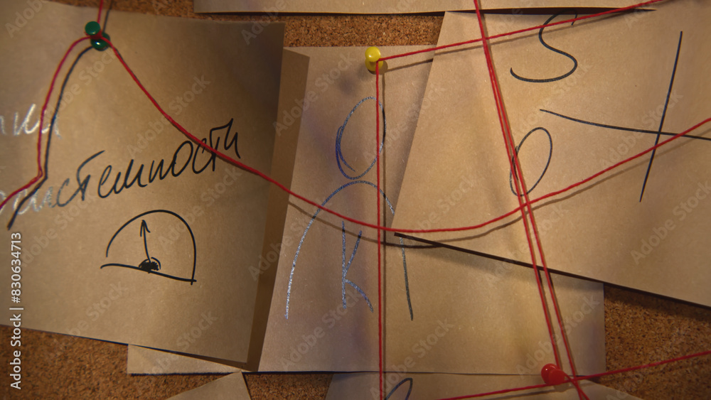 Close-up lighting of notes on board. Stock footage. Flashlight illuminates secret notes on board with threads. Red threads intersect on board with mysterious notes
