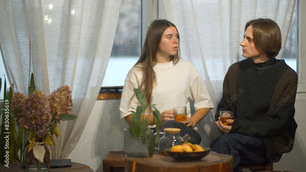 Young man and woman are talking over tea in cafe. Media. Young couple of students are talking with tea in cozy cafe. Couple on student break with tea and comfortable conversation