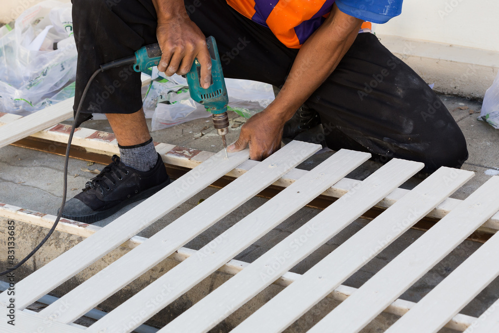 carpenter hands using electric drill on wood at construction sit