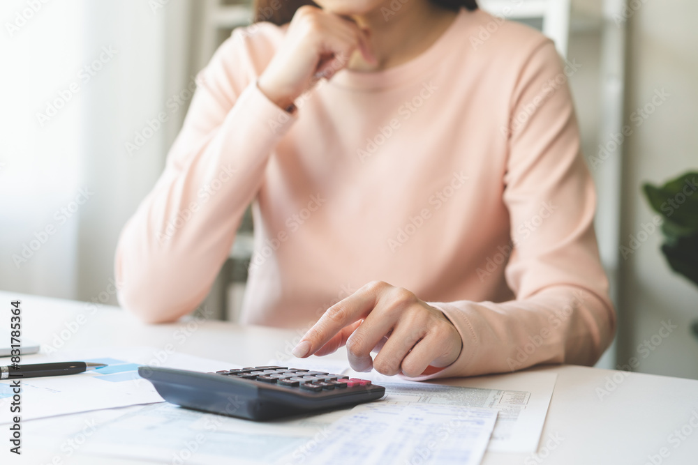 Deduction planning concept. Asian young woman hand using calculator to calculating balance prepare tax reduction income, cost budget expenses for pay money form personal Individual Income Tax Return