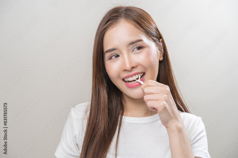 Flossing teeth, dental care hygiene, asian young woman flossing teeth with dental floss pick, smile happy with perfect white teeth, using tooth floss cleaning, healthy teeth isolated on background.