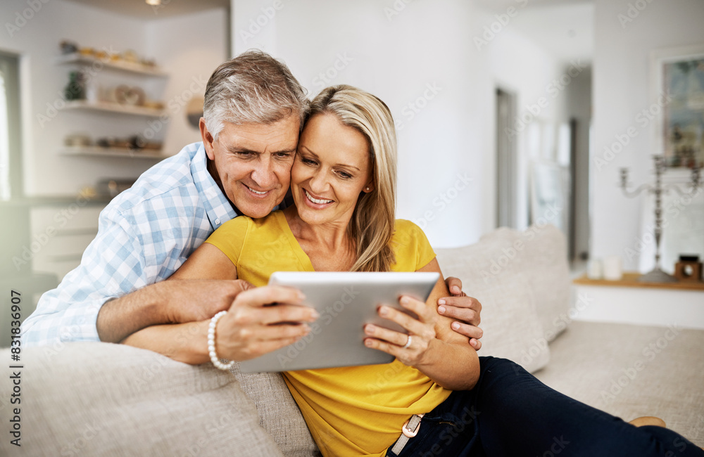 Couple, hug and tablet on sofa for social media, news and online on couch in living room. Technology, internet or app on digital website in home, man or woman mature people in lounge with touchscreen