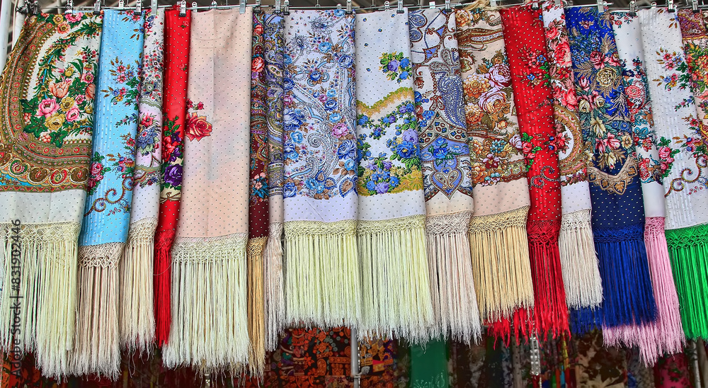 Turkmenistan. Ashkhabad market. Female kerchiefs with traditional ornament