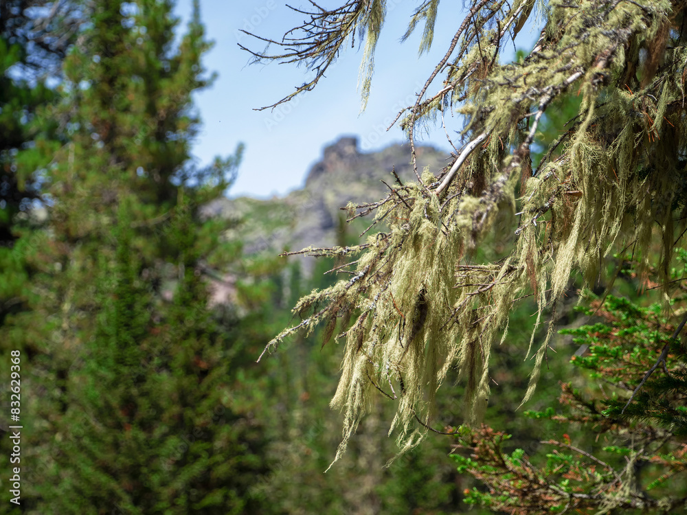 Summer deep wild forest. lichen hanging on the branches of a pine tree.