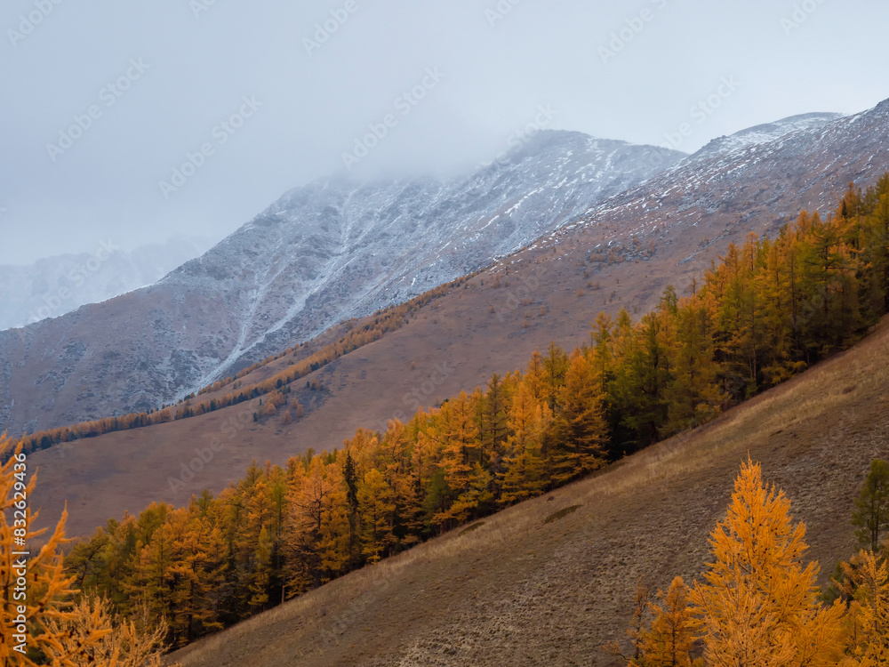 Foggy autumn landscape with mountain top in snowy gray sky.