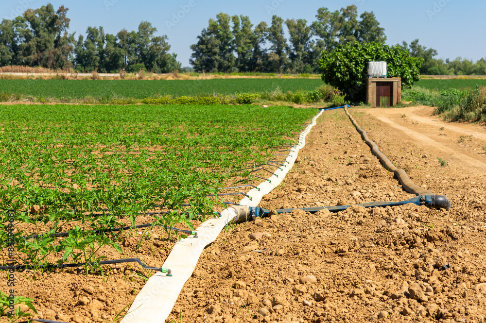 Irrigation Technology: Hoses Leading to Irrigation Shed in Tomato Field.