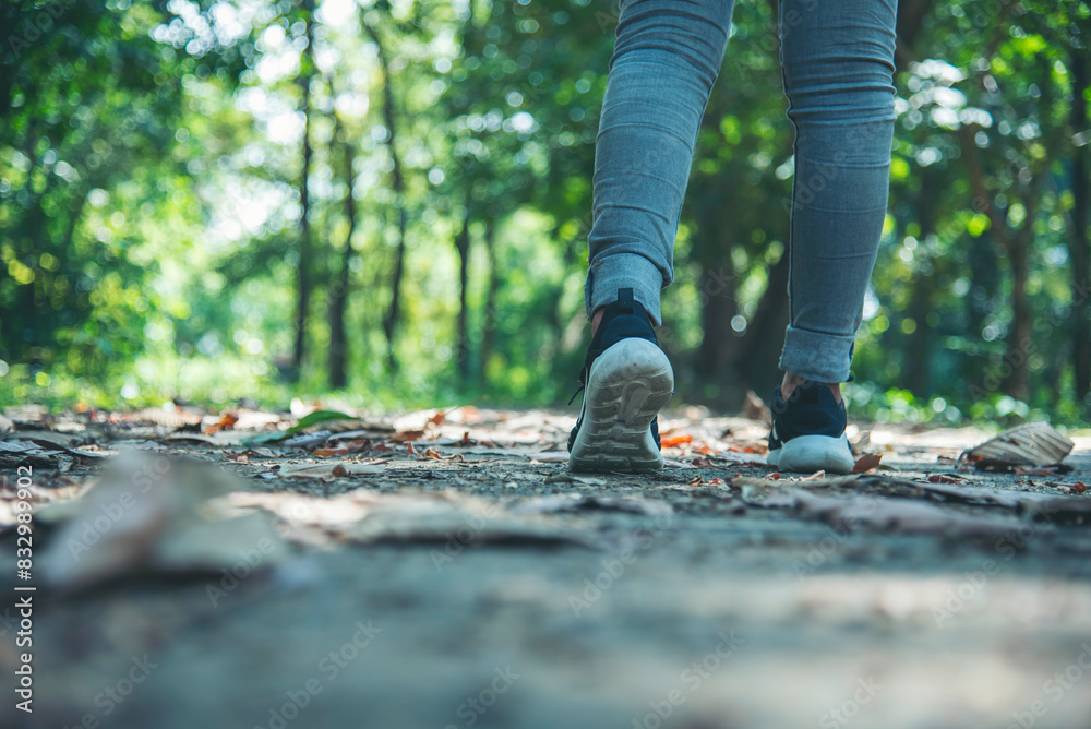 sneaker shoes young woman traveler sit down on summer park. Focus on sneaker shoes and jeans on pathway in forest park. active activity vacation on hike mountain walking way. Young traveler concept