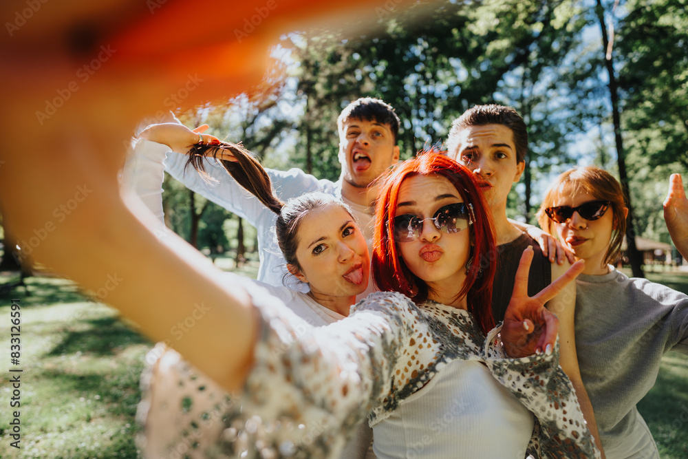 A group of diverse young friends enjoying their day in the park, playfully taking a selfie with humorous expressions.