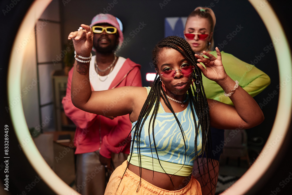 Front view portrait of trendy African American woman dancing with crew in studio and recording videos for social media
