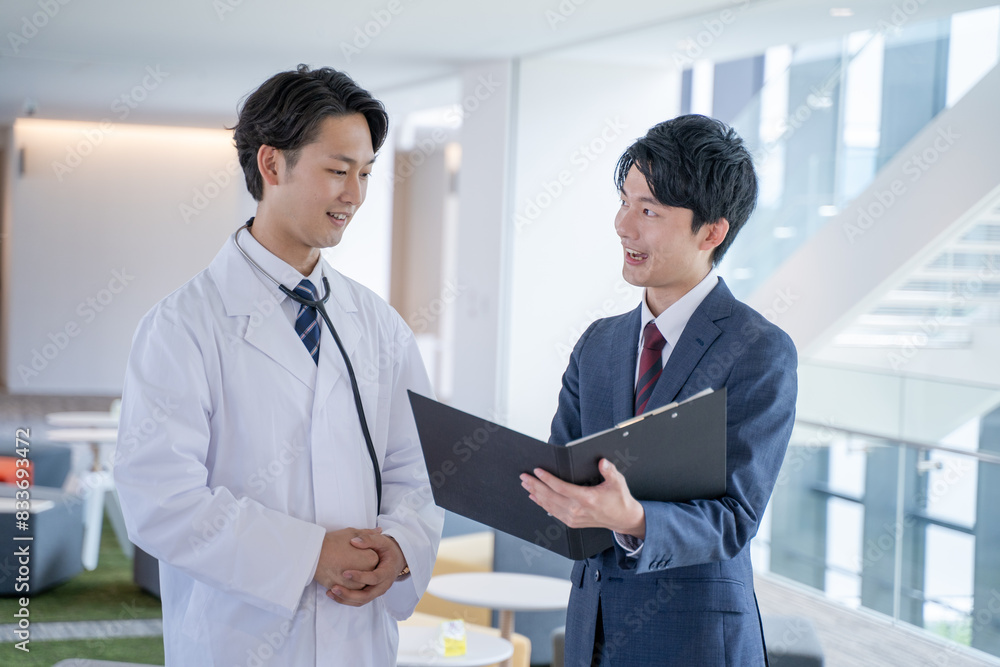 病院で笑顔で会話する男性医師と医薬情報担当者MR
