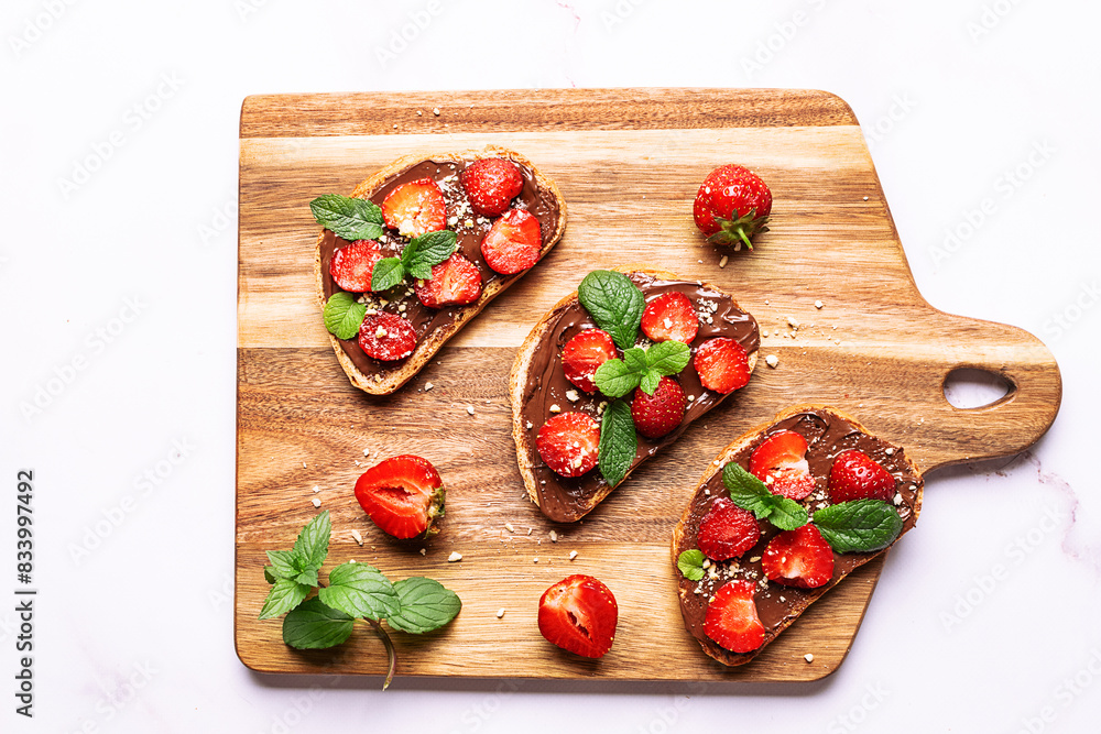 Sweet homemade toasts with chocolate paste, nuts, srtawberry and aromatic mint leaves on the serving plate on white stone background. Tasty summer dessert.