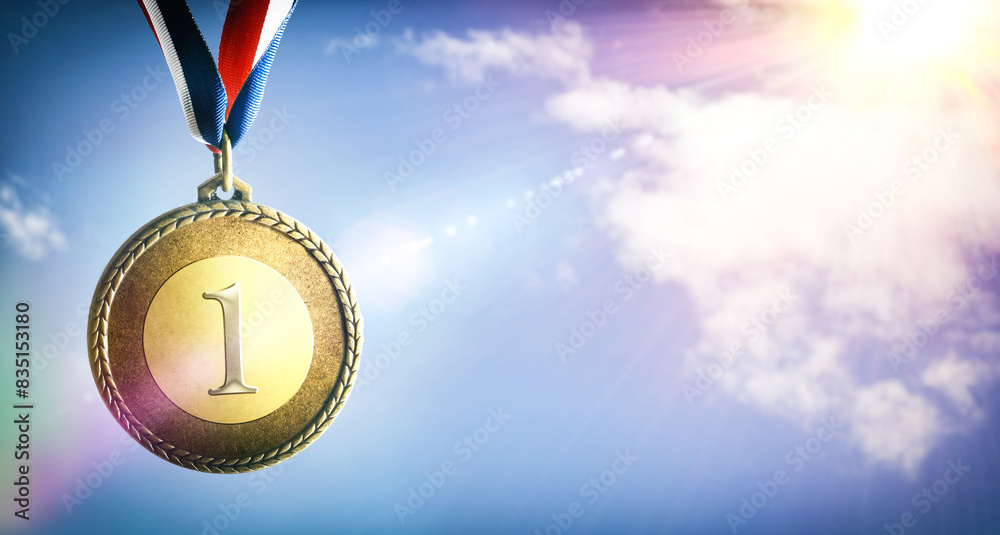 Golden metal medal with blue sky background and sun flare