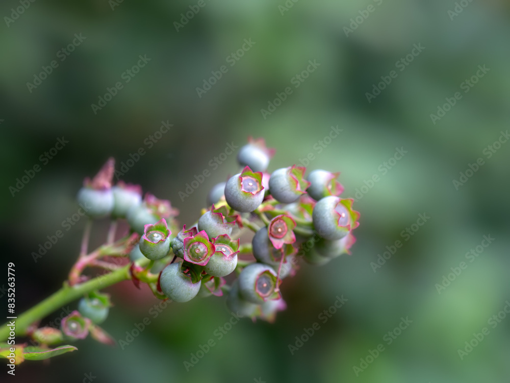 Ripening berries of Blueberry (Vaccinium corymbosum - Unknown Variety) on a branch in early summer