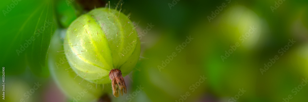 Panorama of Gooseberry on a gooseberry bush (Unknown Variety) in an allotment garden in early summer