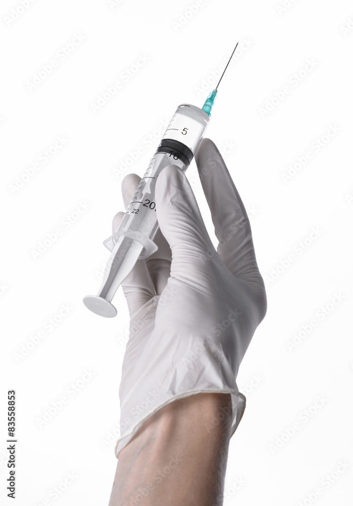 Doctor's hand holding a syringe, white-gloved hand