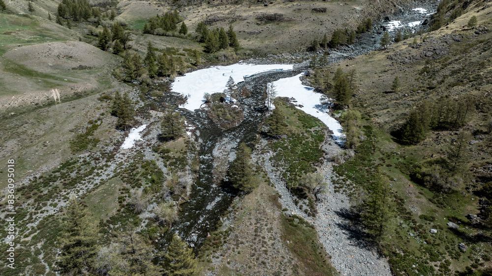 landscape of the surroundings of the village of Kosh Agach mountains with lakes and unusual landscapes in the southern regions of Altai in May