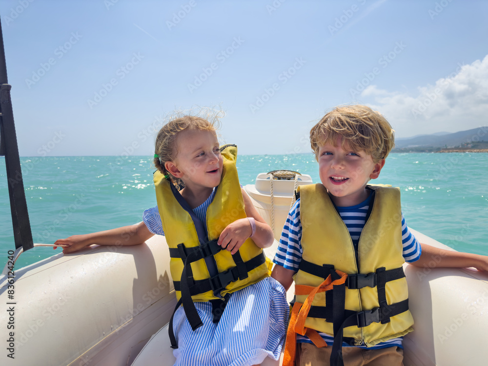 Little adventurers seat in boat wear life jackets at sea walk