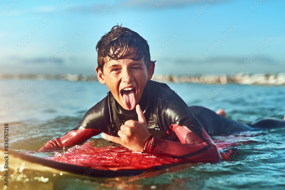 Portrait, boy or excited surfer at sea for fitness training, workout or sports exercise in water. Shaka sign, athlete or male teenager ready to start surfing on outdoor holiday, vacation in Australia