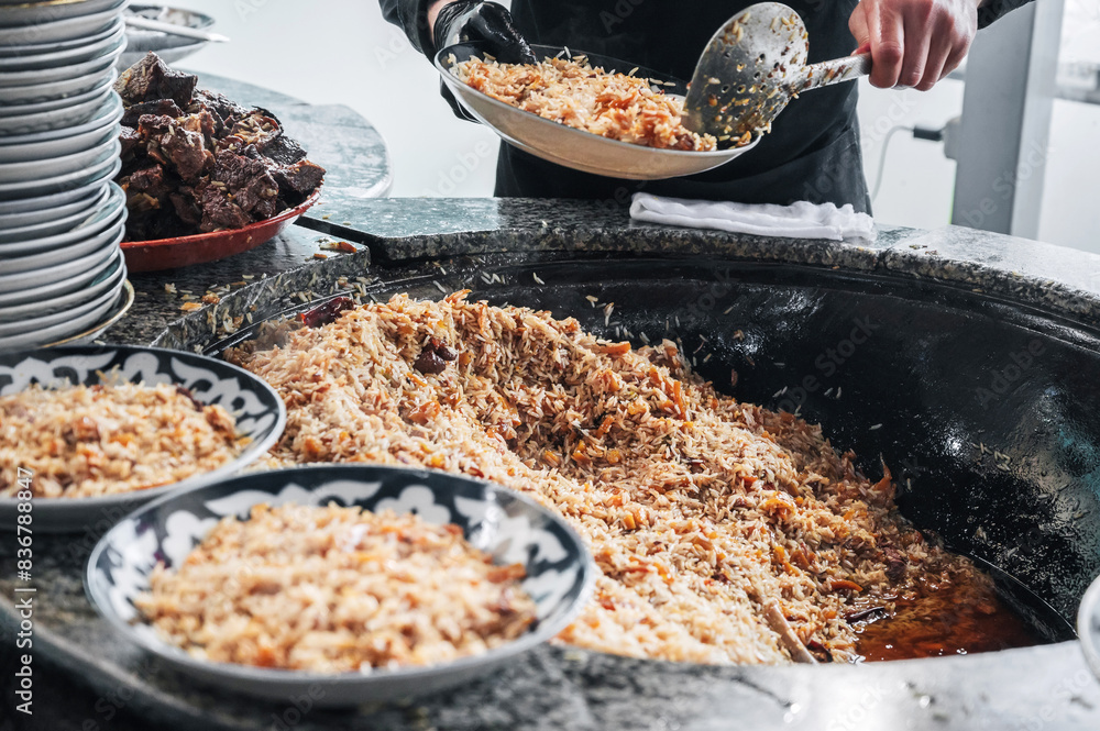 male cook cooking traditional oriental Uzbek rice pilaf in a large cauldron in the kitchen of a restaurant in Uzbekistan